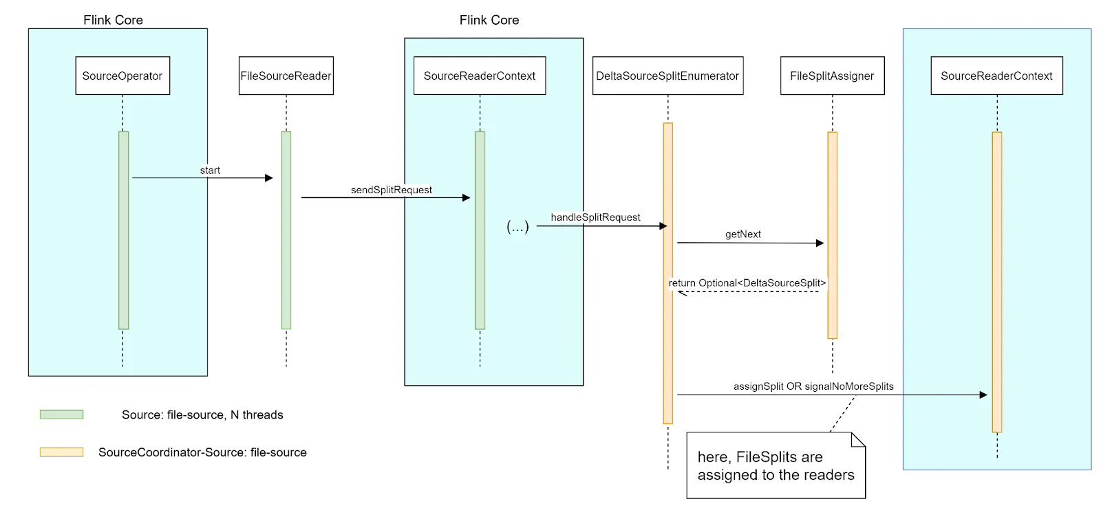 Newly created SourceReaders (each on its own thread) send Split Requests through Flink Core to SplitEnumerator in order to manifest their readiness to process new data. SplitEnumerator responds to these requests by assigning new splits to the readers by calling sourceReaderContext::assignSplit method. Then that split is assigned to the SourceReader by calling SourceReader::addSplits(List<Split>) method by Flink Core.