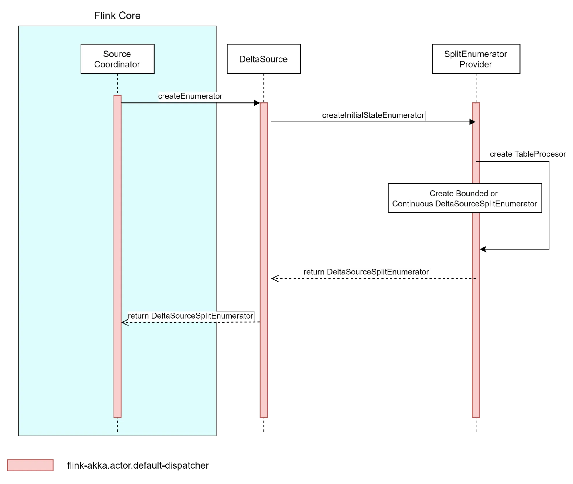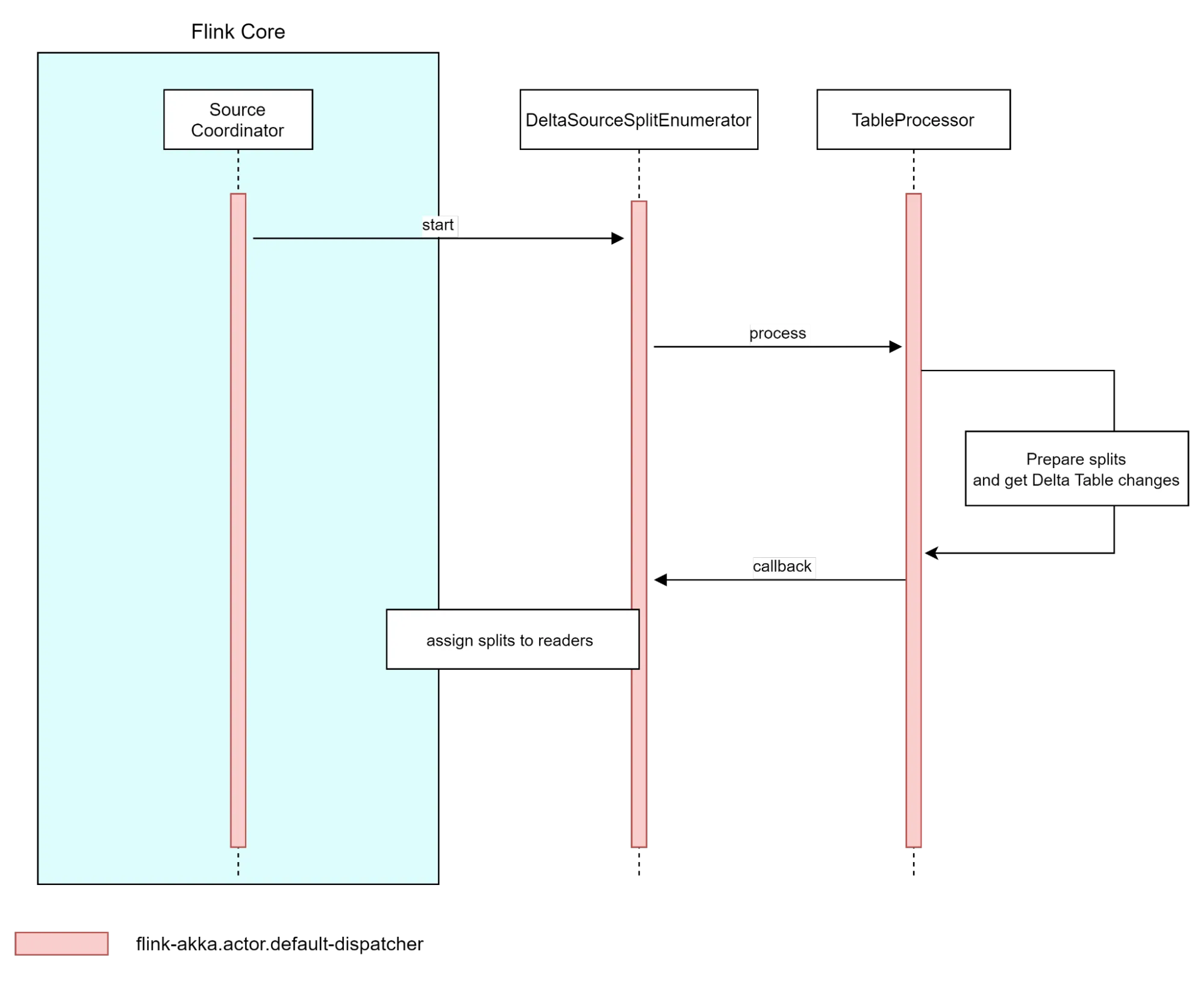 With the creation of the DeltaSourceSplitEnumerator, Flink can process the data via the TableProcessor, prepare the splits and get any Delta table changes prior to assigning the splits to the readers.