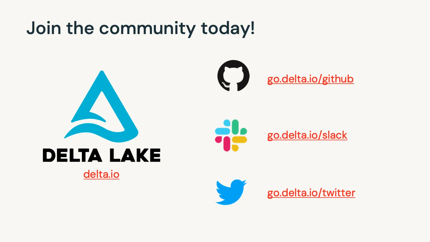 We’re always excited to work with current and new community members. If you’re interested in helping the Delta Lake project, please join our community today through many forums, including GitHub, Slack, Twitter, LinkedIn, YouTube, and Google Groups.