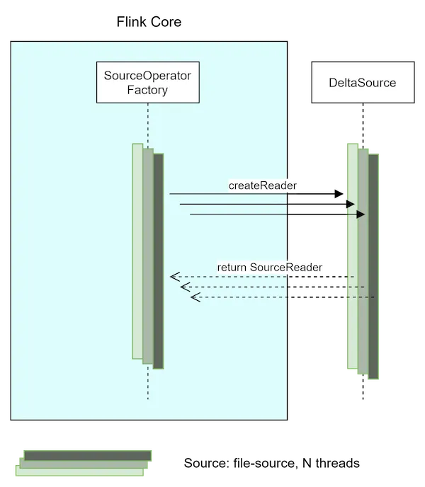 The Source interface, which is implemented by DeltaSource class, is an entry point for Flink’s runtime. The API is used by Flink’s SourceCoordinator, which uses it to initialize the Source instance. The initialization involves creating a SplitEnumerator and, in the case of disaster recovery, recreating it from a previously checkpointed state. Following that, file readers are also created during the source initialization phase.