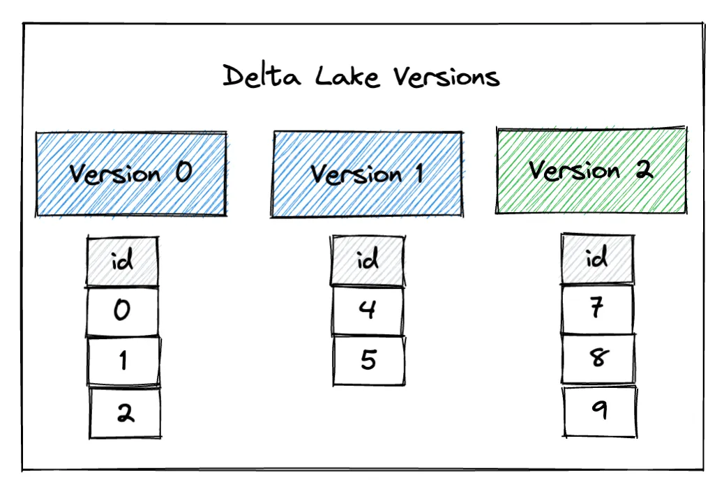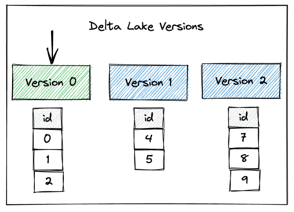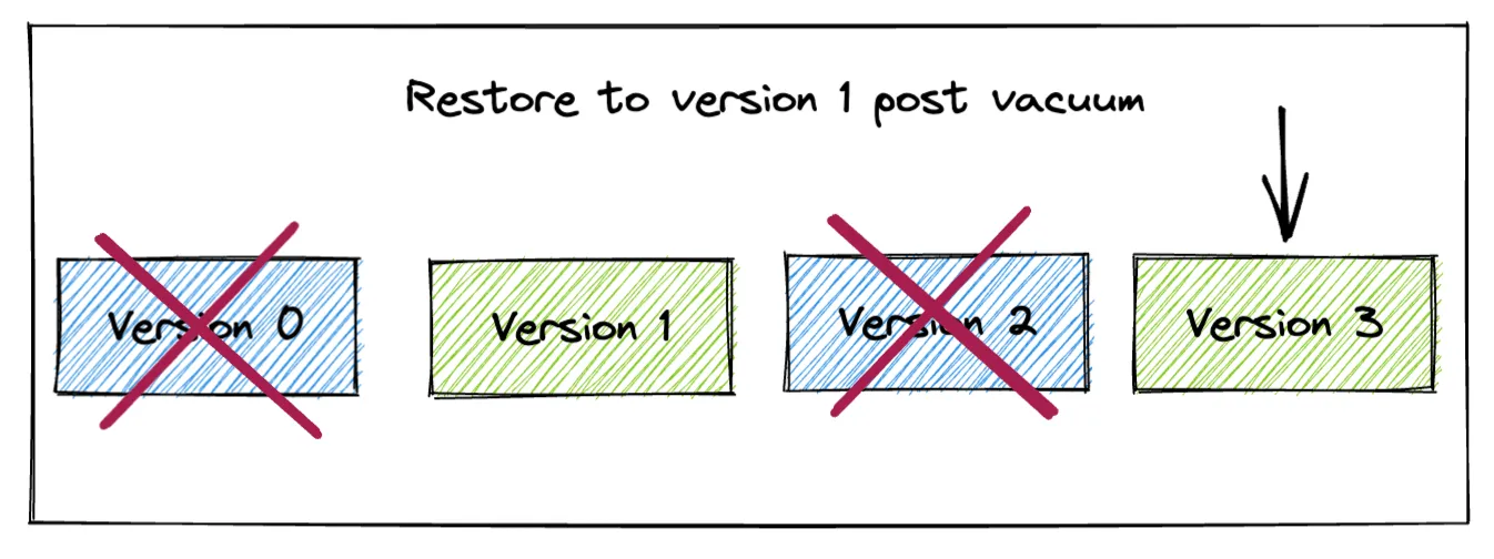 But now that we’ve vacuumed, we can no longer time travel to version 2. The vacuum command has removed the version 2 data, so we can’t access this version anymore. We can’t access version 0 anymore either, as shown in the diagram.