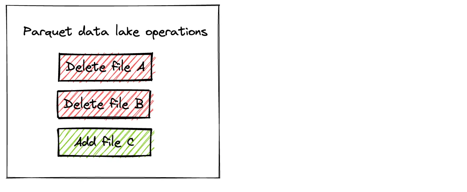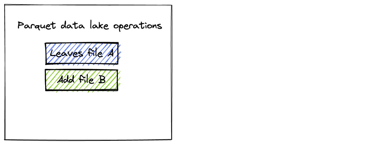 - The Parquet table is in an unusable state for readers while the overwrite operation is being performed. For example, a concurrent reader may see a “mid-computation state”: file A gets deleted but file B still exists, which is not a valid table state.