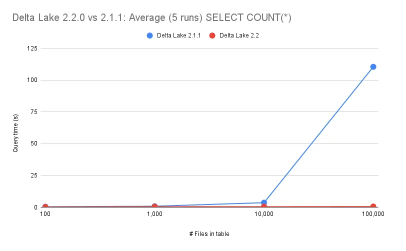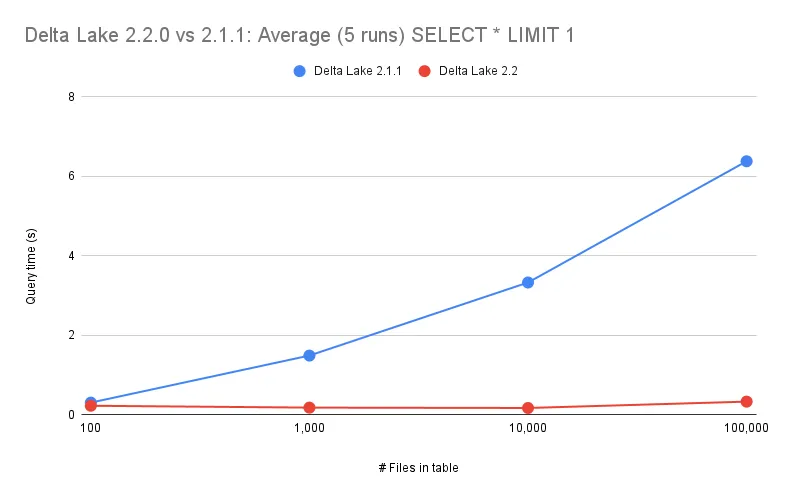For Delta Lake 2.1.1 and earlier, the query runtime increased as the number of files increased. With the new optimizations that were added in Delta Lake 2.2, the query time does not increase as the number of files increases.