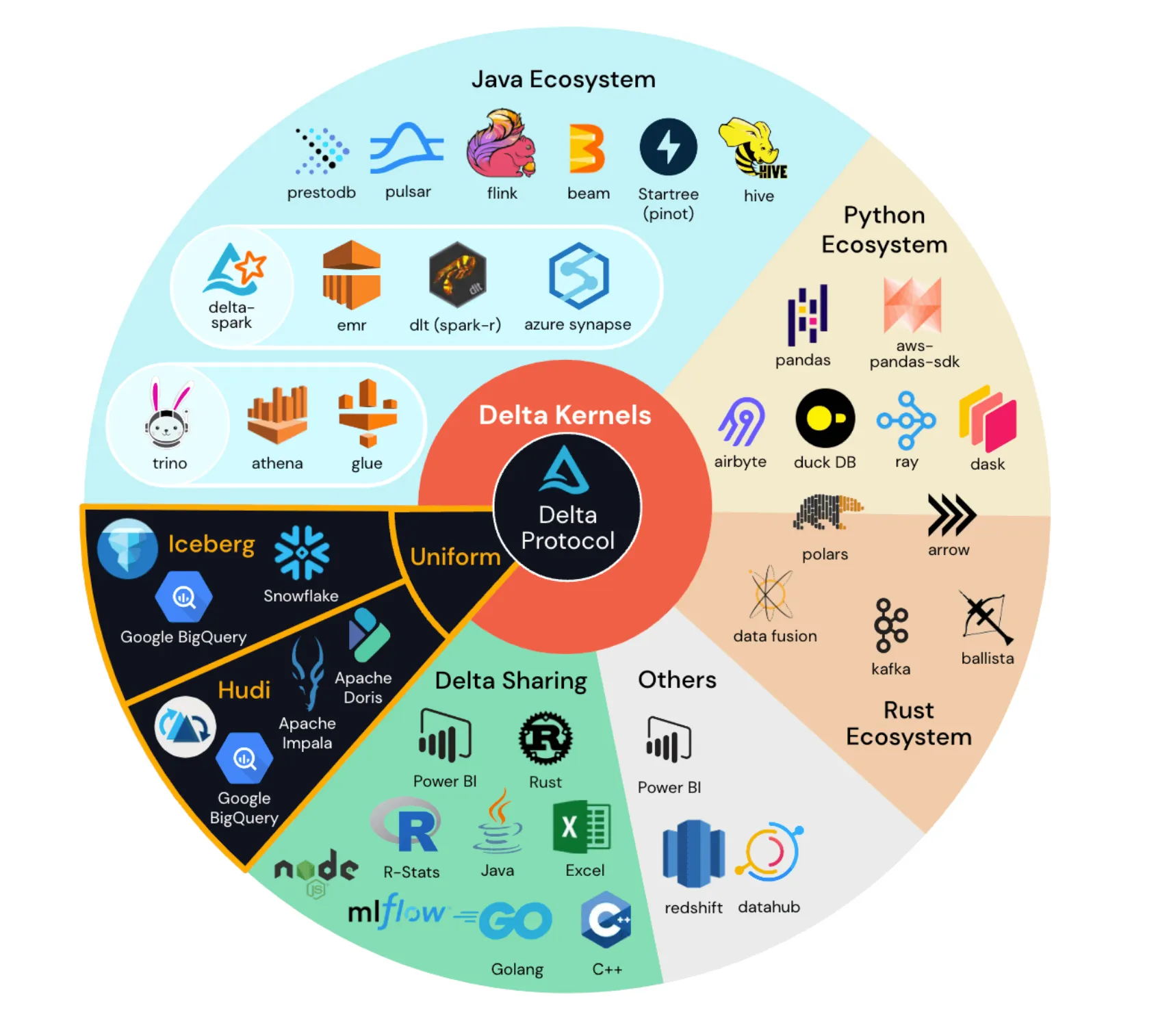 The Delta Lake transaction log protocol is at the center of the universe of Delta Lake implementations as shown in the following diagram: