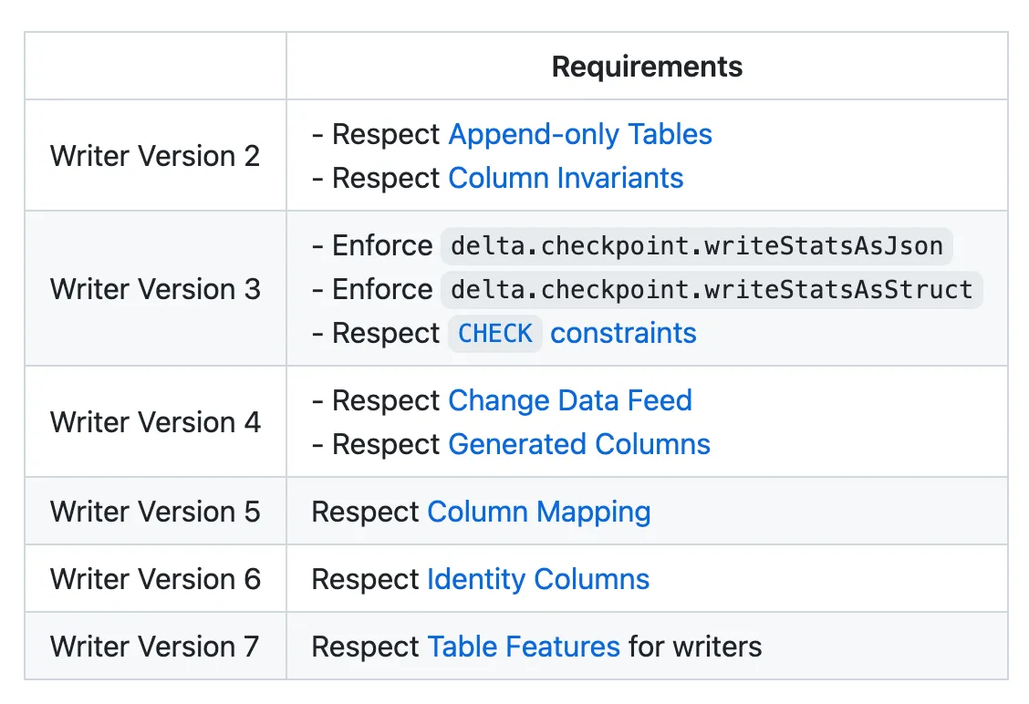 Here are the requirements for the different Delta Lake writer protocol versions: