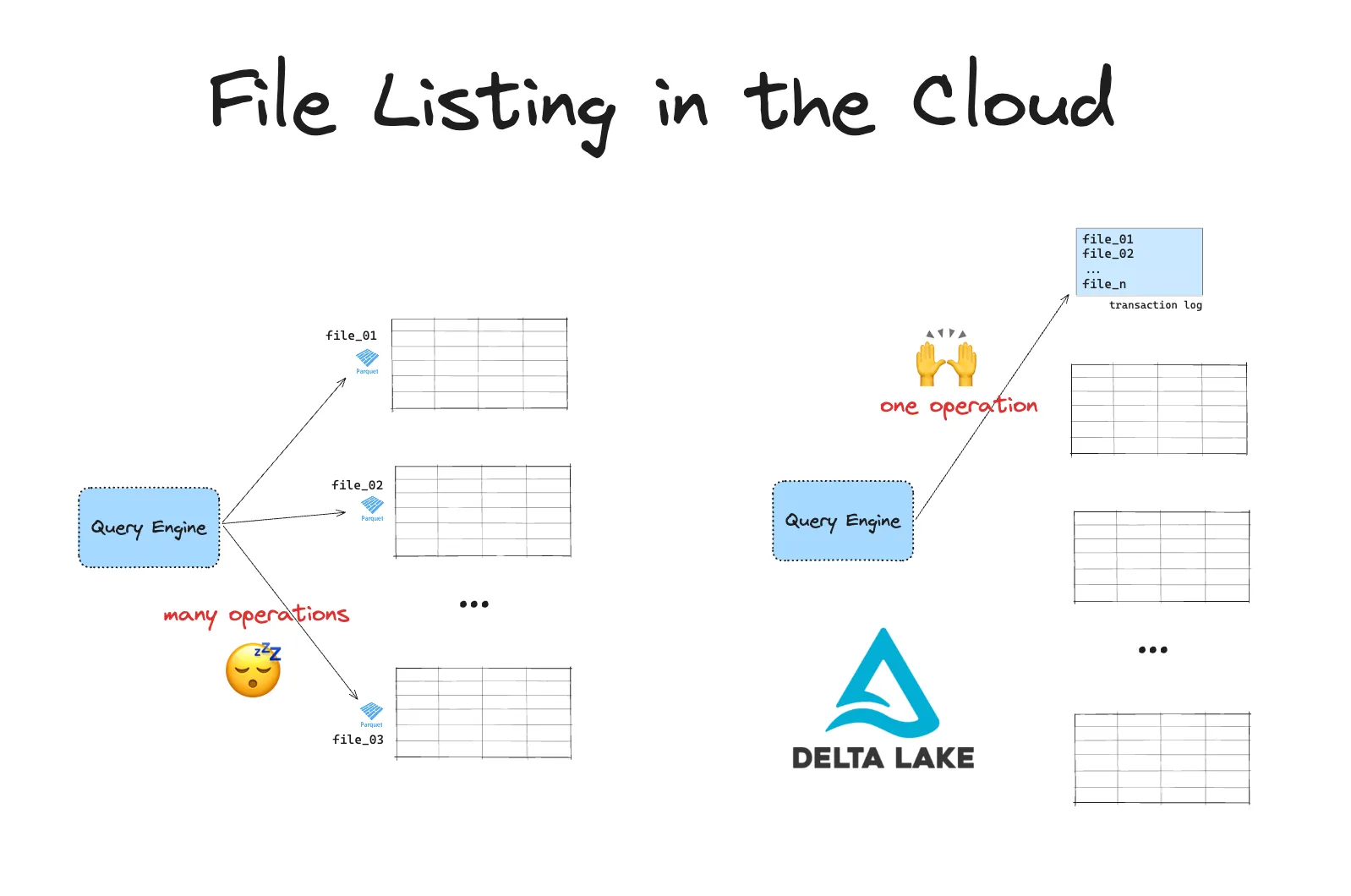 Delta Lake avoids these issues by storing all file paths in a transaction log. Instead of listing files, your engine can quickly access the paths of relevant files in a single operation. This makes querying much faster and more efficient.