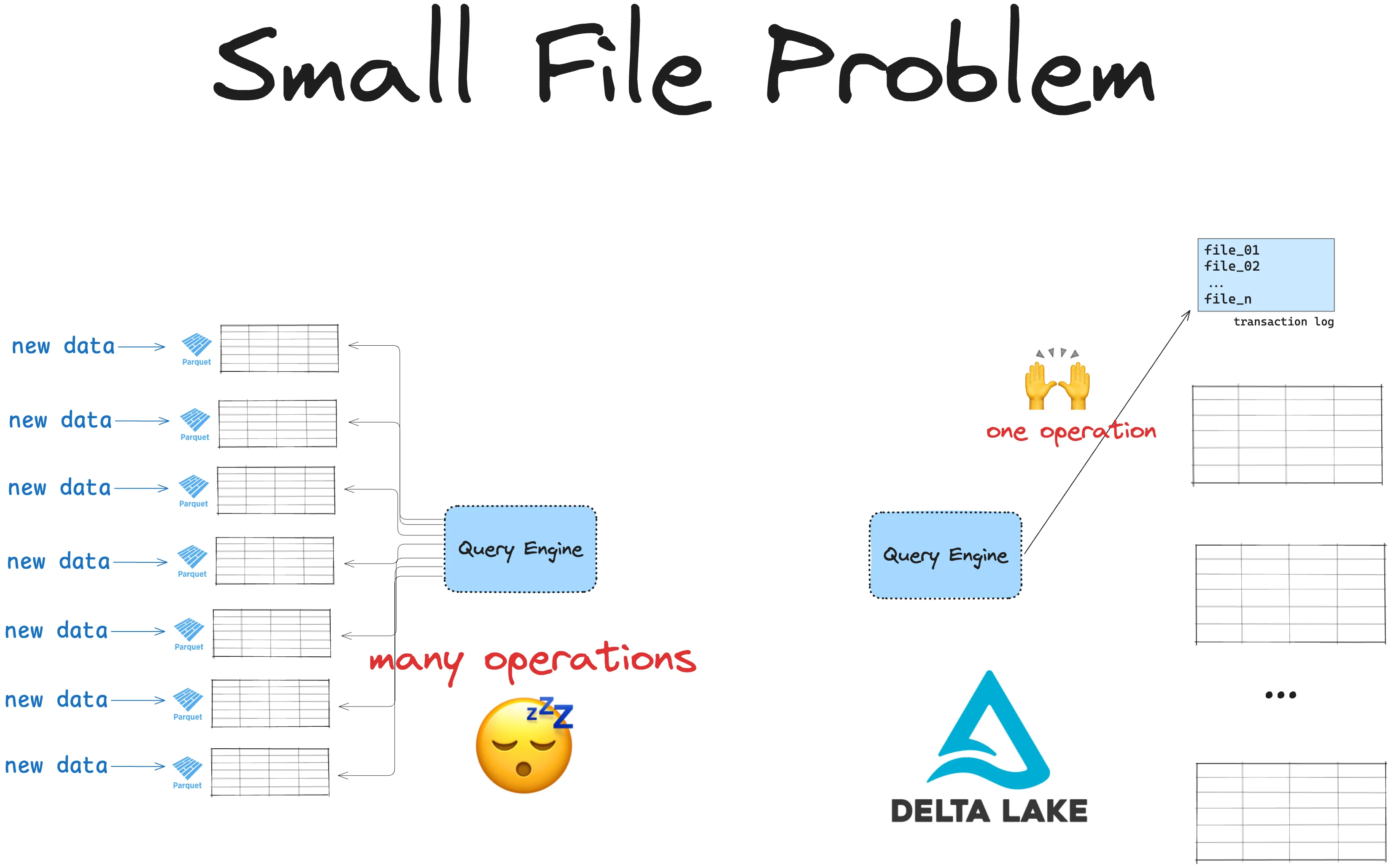 Suppose you have a dataset with 50 million rows of data. Now one of your data points changes (someone changes their address or makes a purchase, for example) and this needs to be updated in the main dataset. You also need to insert a new row. In a dataset stored as Parquet this will require either: (1) an entire rewrite of all 50 million rows or (2) storing updates in many small files, leading to the Small File Problem. Either way, this will be slow and costly.