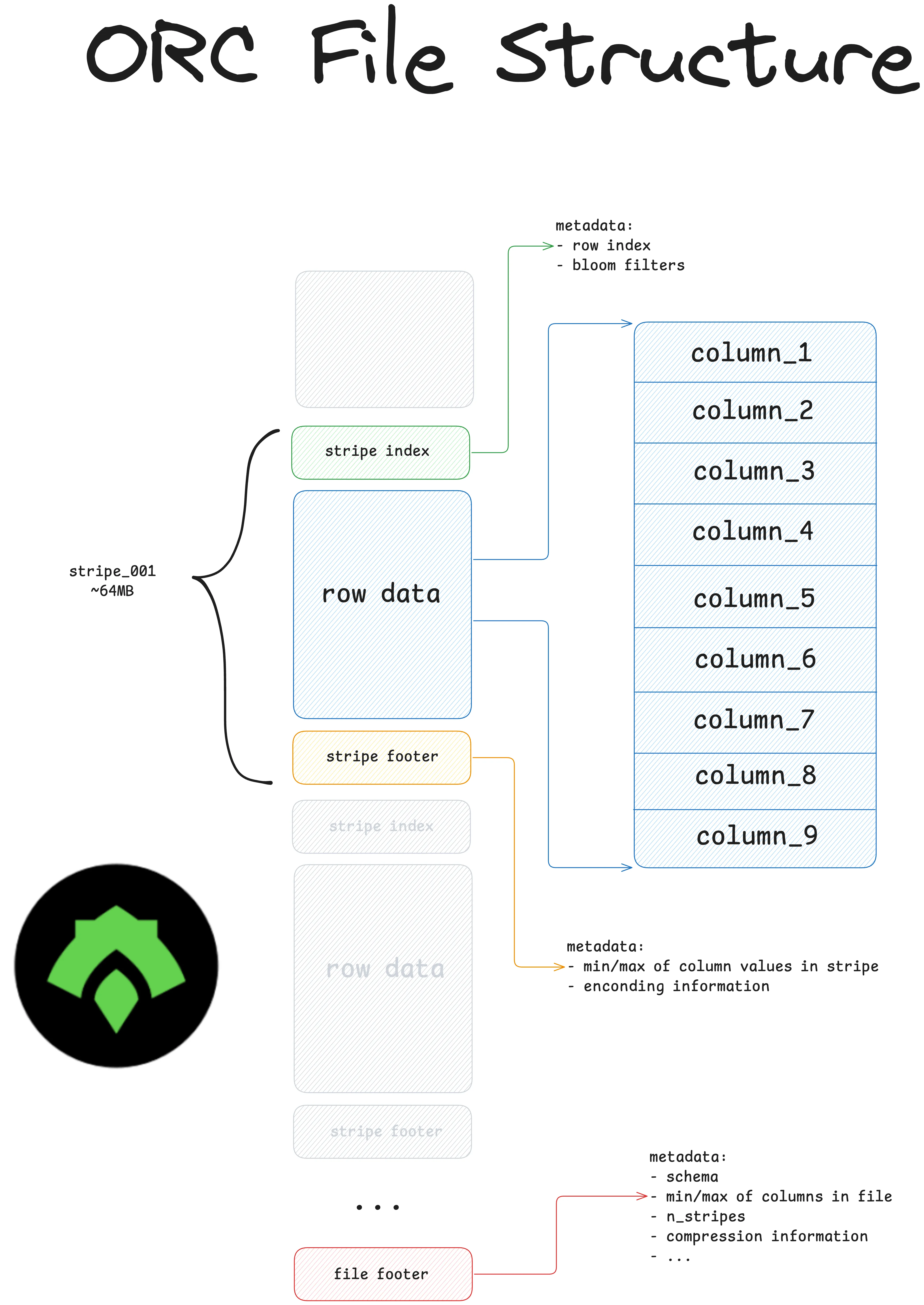 - it stores data in chunks called “stripes”. The file contains metadata for each stripe, which enables query optimization via data skipping.