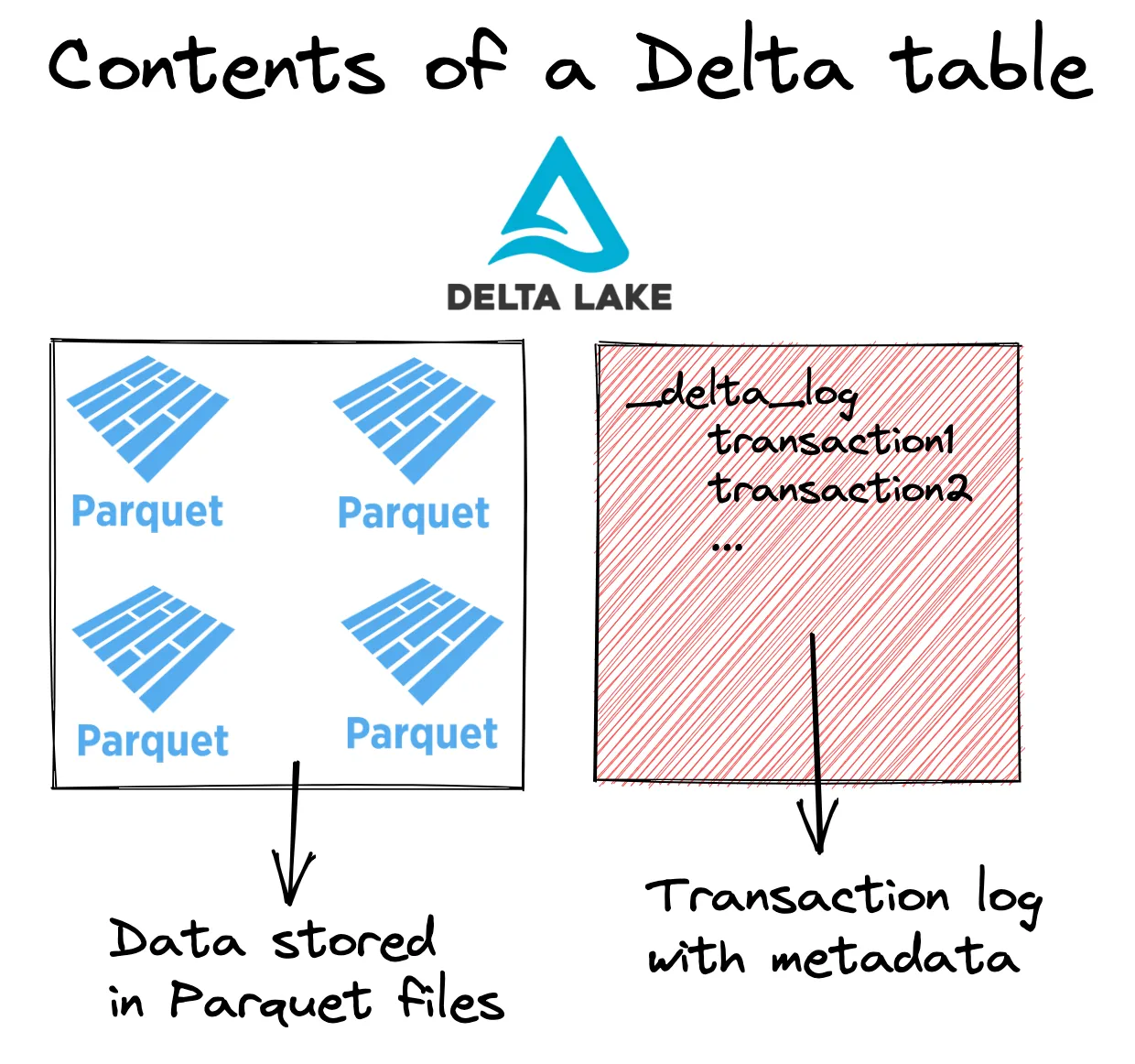 Delta Lake stores metadata in a transaction log and table data in Parquet files. Here are the contents of a Delta table.