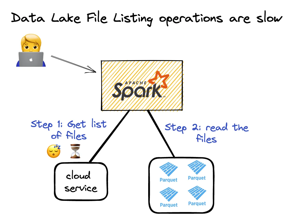 Parquet files store metadata for row groups in the footer, but fetching all the footers and building the file-level metadata for the entire table is slow. It requires a file-listing operation, and we’ve already discussed how file-listing can be slow.